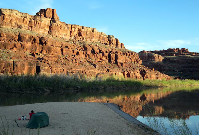 Once the tent was up we headed out for a few hours east of the canyon by scrambling up slabs and broken rock onto the plateau for some grand distant views both back east to Canyonlands national park and west to the snow capped Henry mountains where we are heading next! We reached a canyon overlook and disturbed some swifts - a grand wander!